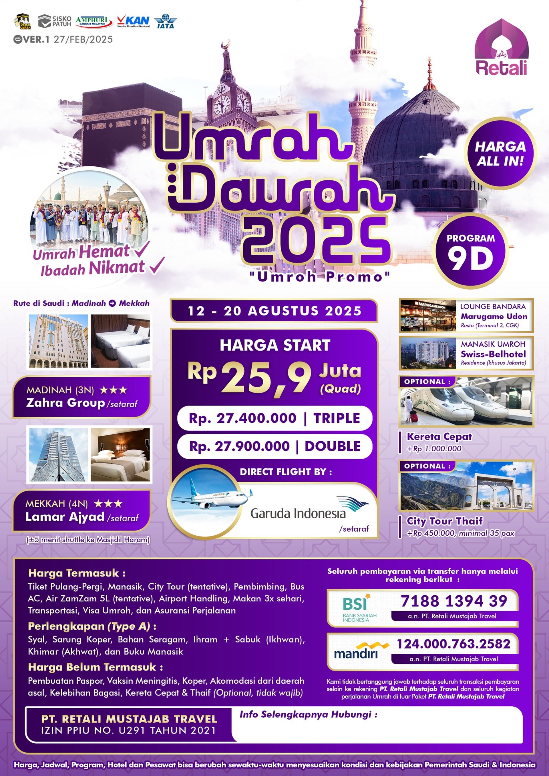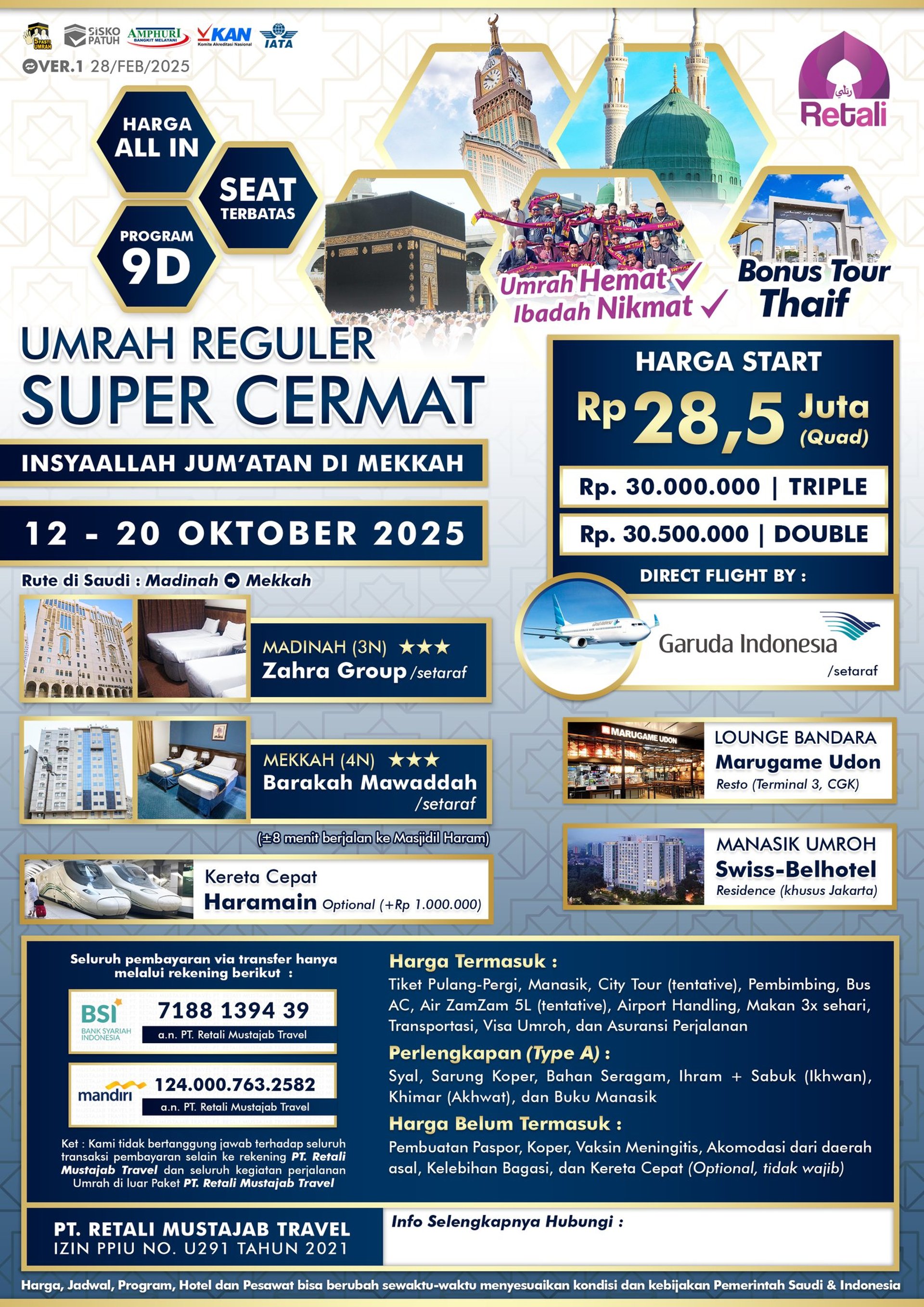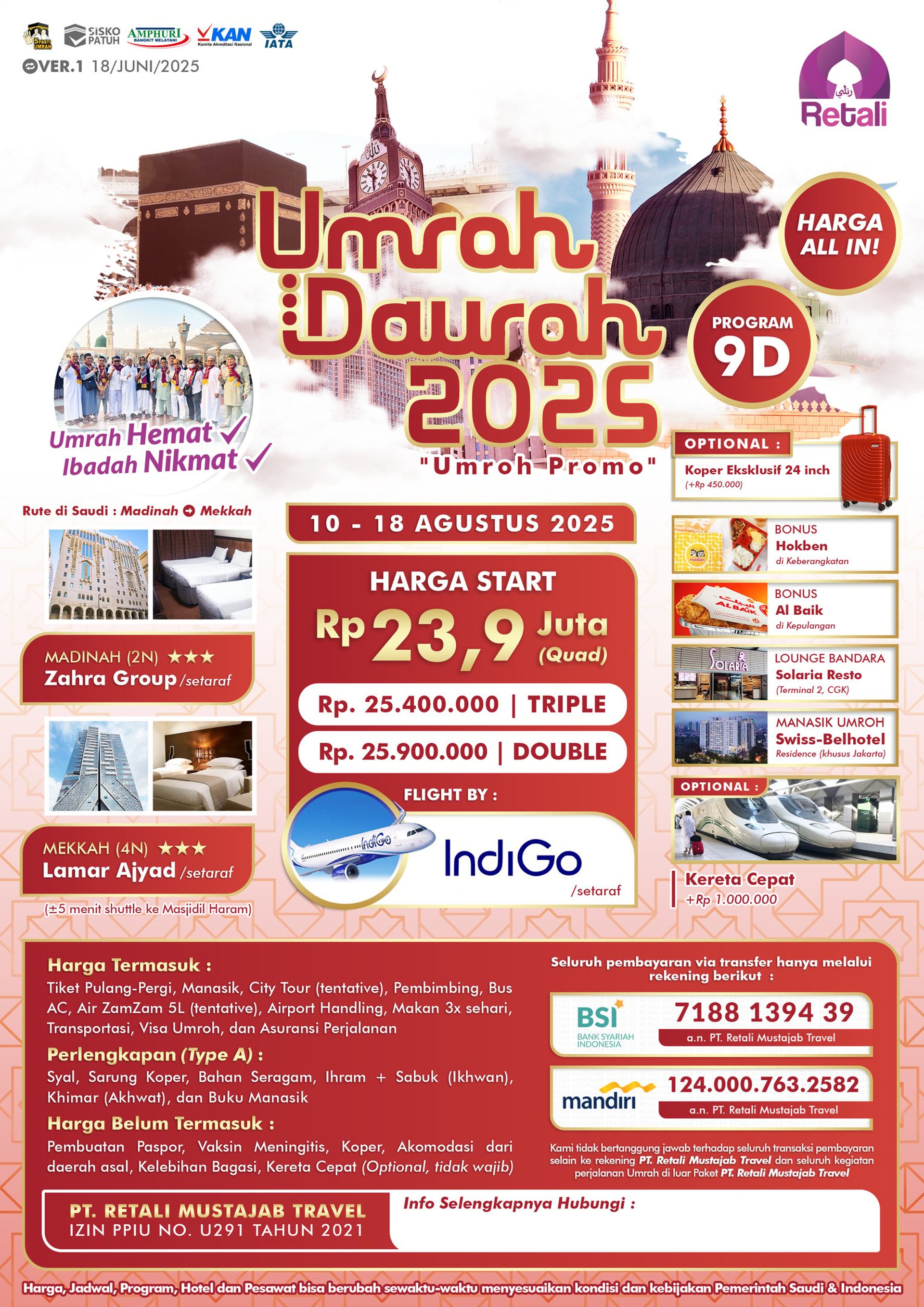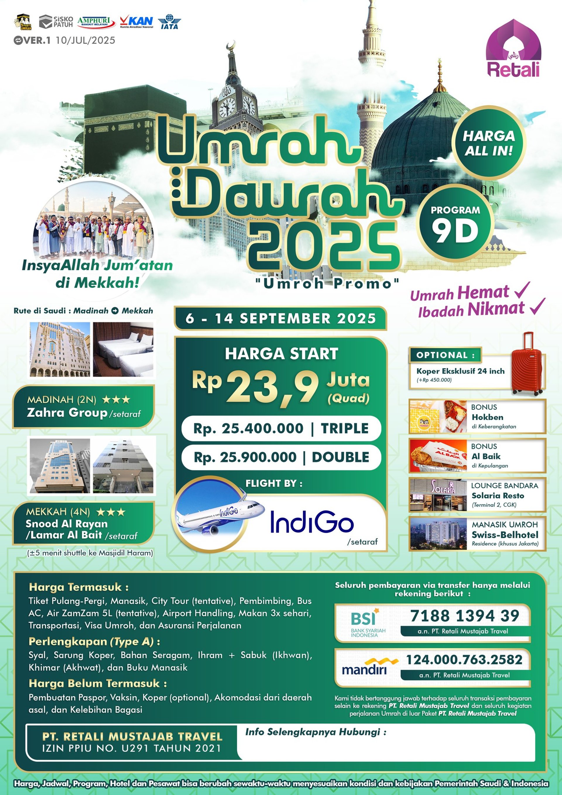 Travel umroh terpercaya sejak 2015. Retali mustajab travel juga memiliki keunggulan lain seperti, keberangkatan tepat waktu, Ibadah sesuai tuntunan Al-Quran & Sunnah, & tentunya retali mustajab travel adalah travel umroh terbaik!