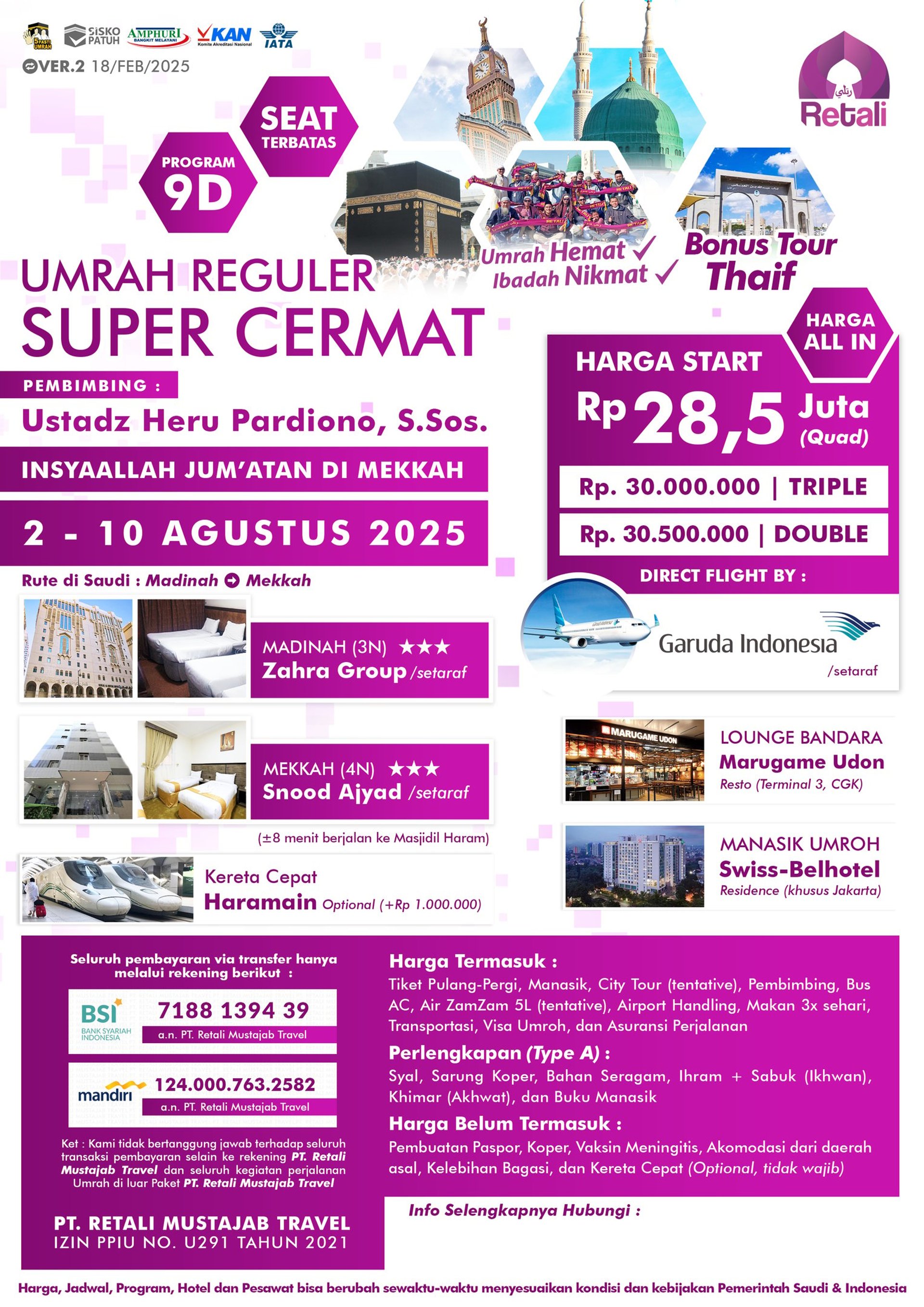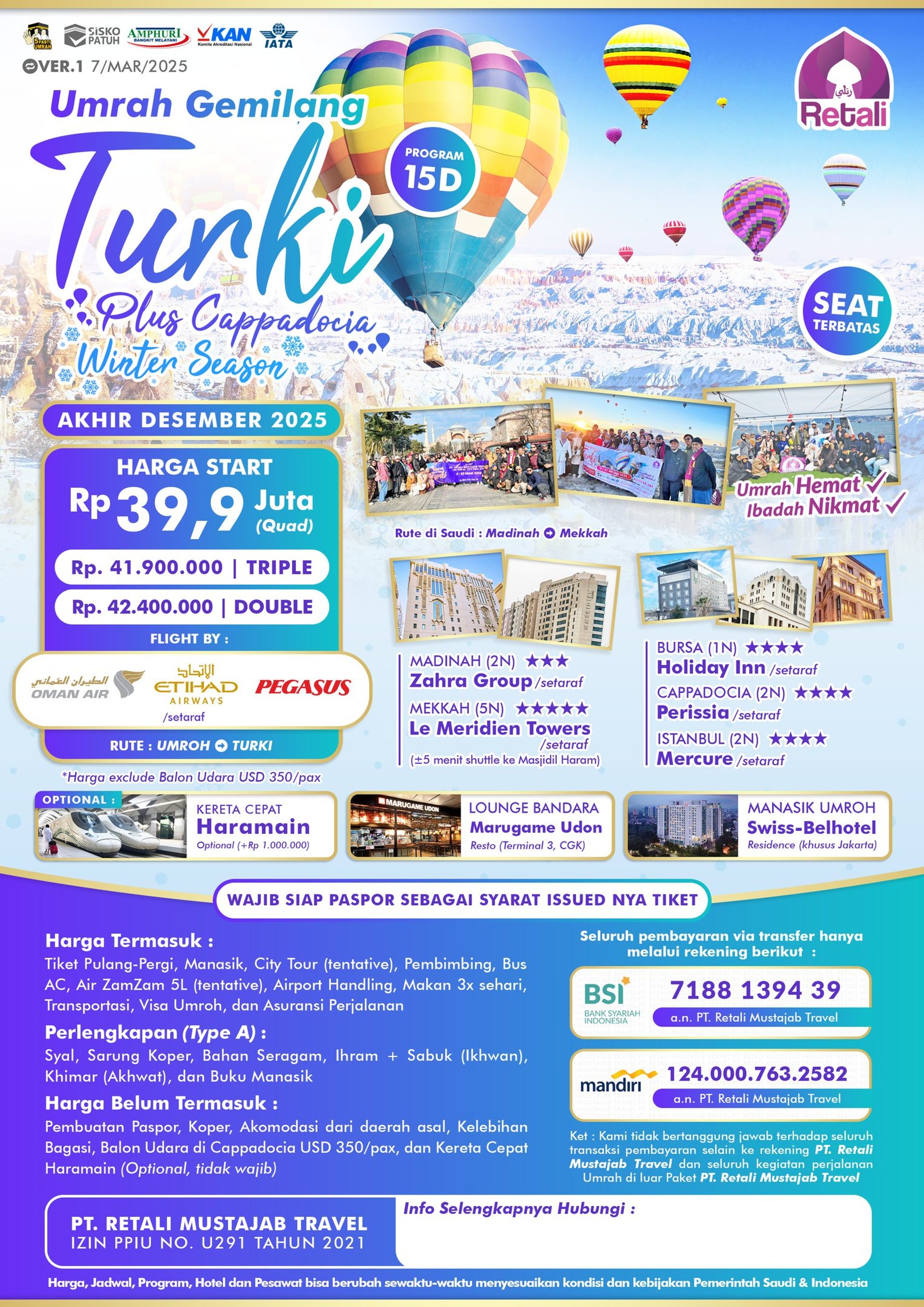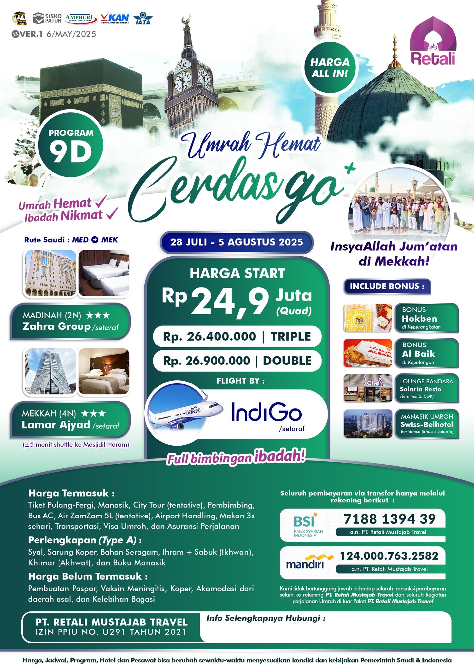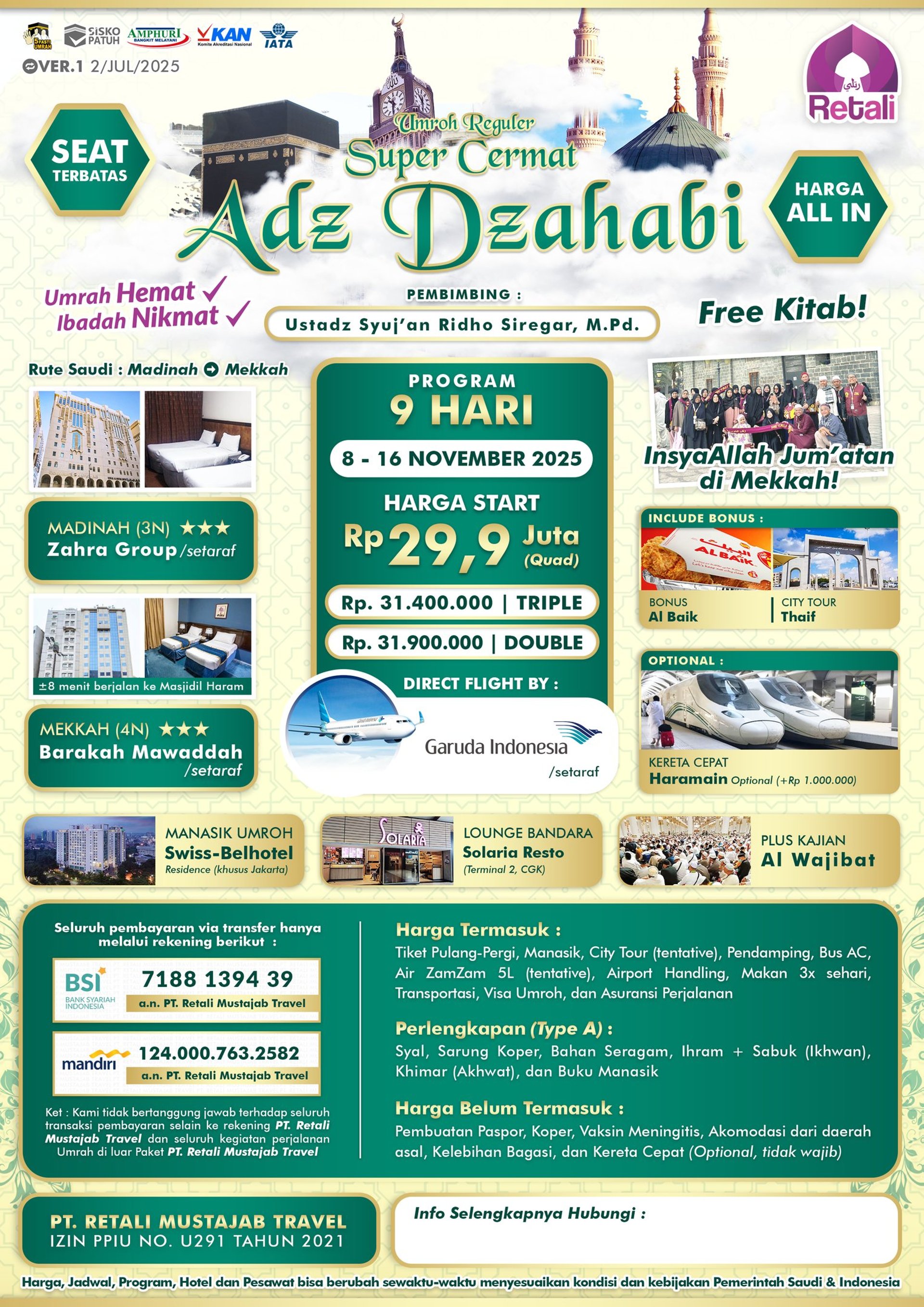 Travel umroh terpercaya sejak 2015. Retali mustajab travel juga memiliki keunggulan lain seperti, keberangkatan tepat waktu, Ibadah sesuai tuntunan Al-Quran & Sunnah, & tentunya retali mustajab travel adalah travel umroh terbaik!